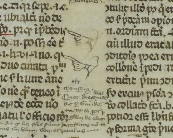 Il s'agit d'une manicule, symbole que l'on retrouve fréquemment dans les manuscrits médiévaux. Il a été utilisé par la suite en typographie et a suivi les évolutions des nouvelles technologies sous une forme que nous connaissons tous, un pointeur de souris indiquant la présence d'un lien hypertexte.