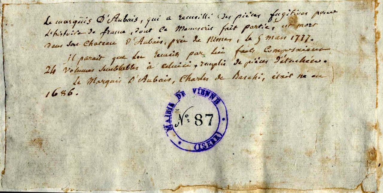 En effet, ce membre de la noblesse de la région de Nîmes était connu pour être un passionné de documents anciens. Il avait rassemblé dans son château d’Aubais une collection estimée à 25000 volumes et avait pour habitude de constituer des recueils factices (pièces manuscrites ou imprimées reliées dans un même volume) de manuscrits rares. Suite à son décès, sa collection fut dispersée par sa fille au moment de la Révolution de 1789.