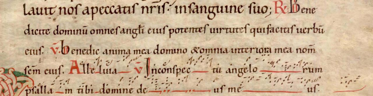 La calligraphie aide également à situer le manuscrit dans son contexte historique. Cette écriture en minuscule était en usage à l’époque romane (11e-12e siècles) dans un style dérivant de la caroline (écriture carolingienne). Le texte en latin contient de nombreuses abréviations. Contrairement à ce que l’on pense celles-ci ne permettaient pas au copiste de gagner du temps, mais répondait à un soucis d’esthétique : elles rendaient la longueur des lignes plus harmonieuse.