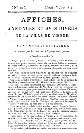 - Feuille d’annonces ou d’affiches de Vienne (Isère), autorisée provisoirement par M. le Préfet de janvier 1811 à décembre 1811 ;